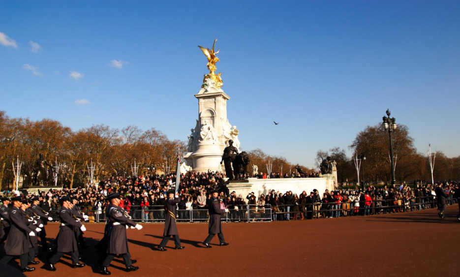 바로앞에 빅토리아 메모리얼이라고 분수를 끼고 있는 기념물 위에서 근위병교대식을 바라보면 가장 잘 볼 수 있는것같아요. 너무 많은 인파때문에 아래쪽에서는 제대로 볼 수 없습니다. 하지만 여기도 아침 일찍부터 가있지 않으면 사람들이 너무 많아서 자리잡을 수 없었습니다. ㅠ