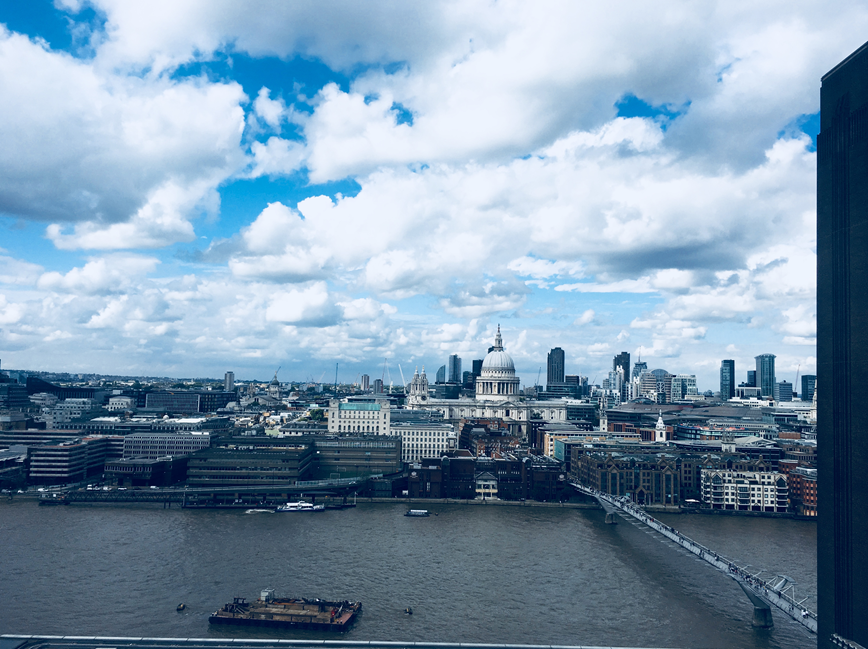 테이트모던은 과거 화력발전소였던 곳을 리뉴얼해서 미술관으로 탈바꿈 한 곳인데, 가장 위층으로 올라가면 여기 또한 런던 시내를 한눈에 볼 수 있는 곳입니다. 건너편에 있는 세인트폴대성당도 보이네요.