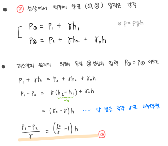 위 식에서 비중량, 비중 자리에 분모는 '관 속의 유체', 분자는 '액주계 내 유체' 라는 것을 반드시 기억해 둡니다.