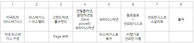 3. 시간을 배분해보고, 국내선 장거리 이동은 비행기 표 시간에 맞춰서 또 짜본다 (예를들어 라스베가스-샌프란 갈 때 아침비행기인지, 저녁비행기인지)